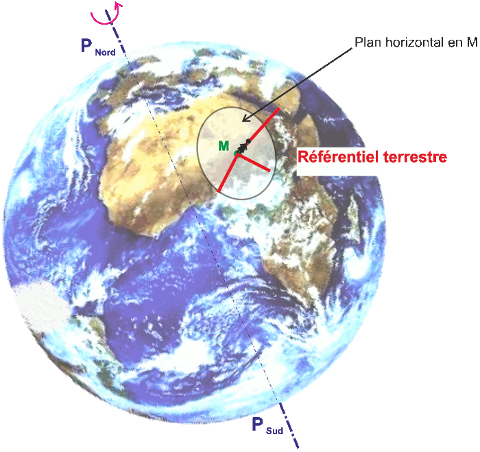 Le référentiel terrestre est centré en un point de la surface de la Terre et ses axes, liés à la Terre, sont entraînés par la rotation terrestre.