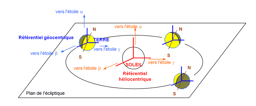 - Le référentiel héliocentrique a pour origine le centre du Soleil et ses axes sont définis par rapport