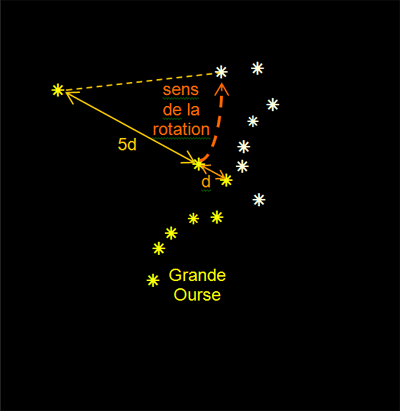 Les étoiles Dubhe et Merak tournent dans le sens direct, sens contraire des aiguilles d'une montre, autour de l'Étoile Polaire.