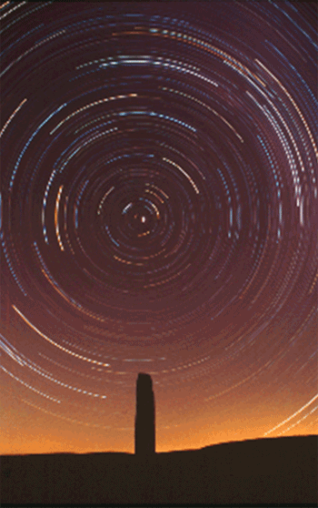 Rotation apparente du ciel autour de l'Étoile Polaire, au-dessus du site mégalithique du mont Lozère.(Photographie d'Olivier Sauzereau.Pose 3 h) |