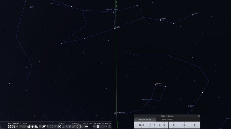 Le 9 mars, les étoiles Dubhe et Merak de la Grande Ourse sont à 0 h (1 h en heure légale en France) à la verticale de l'Étoile Polaire et au-dessus de celle-ci.