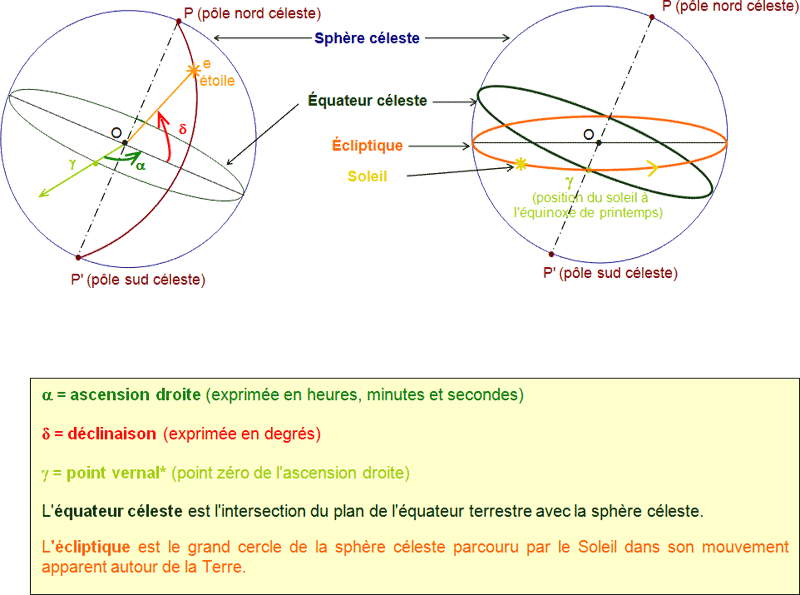 Une étoile est repérée sur cette sphère par deux coordonnées : son ascension droite α et sa déclinaison δ.