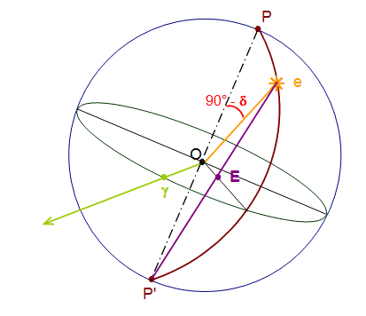 E est la projection stéréographique de l'étoile e de la sphère céleste. |