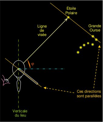 À l'échelle humaine, l'Étoile Polaire étant située à une distance considérée comme infinie de la Terre, on peut dire que la ligne de visée de l'Étoile Polaire et l'axe de la Terre sont assimilables à des droites parallèles (d'autant plus que l'on a négligé l'écart bien plus considérable entre la direction de l'Étoile Polaire et celle de l'axe terrestre).