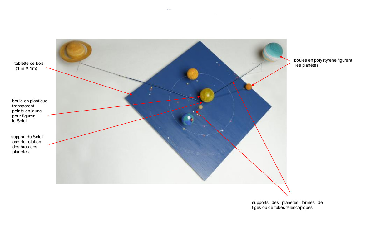 Sur une tablette de bois (1 × 1 m) peinte en bleu sont tracées quatre cercles représentant les trajectoires des quatre premières planètes. Le rayon de chaque cercle est la distance Soleil-Planète déterminée grâce au tableau de la fiche "calculs". Sur le cercle de la Terre les mois sont repérés.