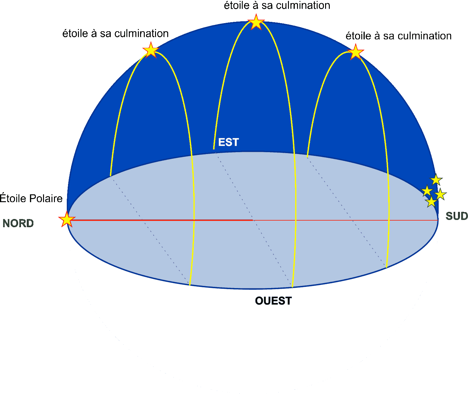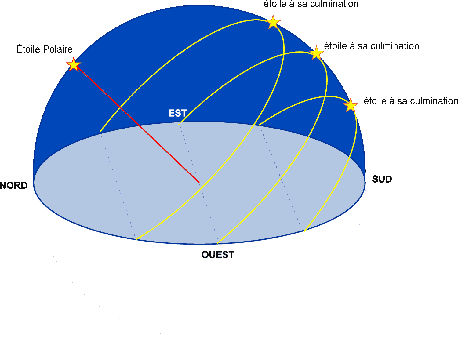 Dans la zone de latitude moyenne de l’hémisphère Nord le ciel semble s'organiser de façon circulaire autour de l'étoile polaire qui est un repère fiable.