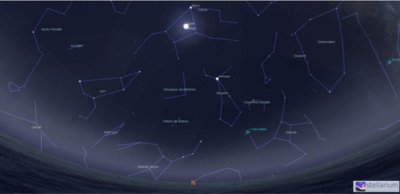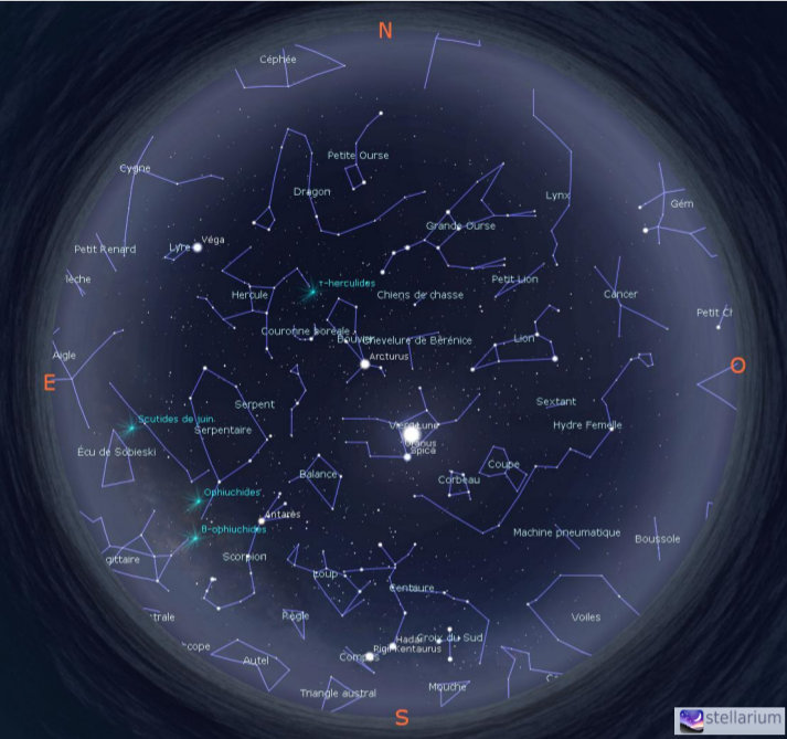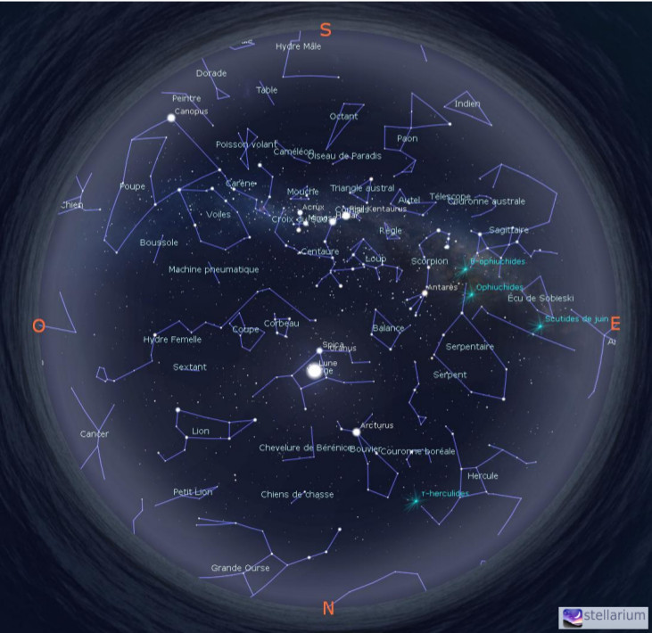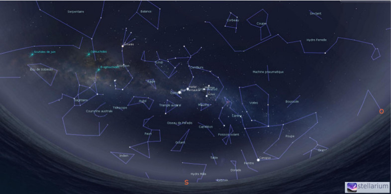 Grâce au logiciel Stellarium il est possible d’observer le ciel en un lieu, à une date et à une heure données. Les constellations sont celles définies par l’Union astronomique internationale (UAI).