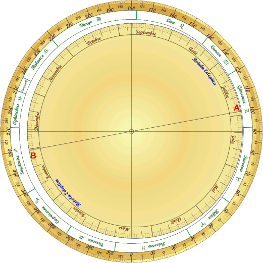 Les points A et B, intersection de la droite (OE) avec le cercle des dates doivent indiquer les dates correspondant au périhélie et à l'aphélie du barycentre du système Terre + Lune.