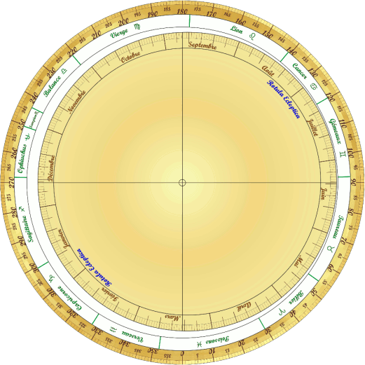 - Sur une deuxième couronne (Rexterne = 10,2 cm, Rinterne = 9,4 cm) tracer le calendrier des constellations zodiacales. (voir la deuxième couronne du disque de base)