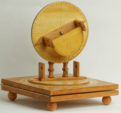➩ La pointe de l’alidade (regula longitudinis) indique l’azimut du Soleil en degrés (mesuré de 0 à 360° vers l’est comme sur une boussole).