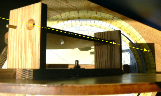 ➩ Régler l’alidade à pinnules (regula latitudinum) sur les zéros de la crista, le fil à plomb indique sur le semis la hauteur du Soleil au-dessus de l’horizon.