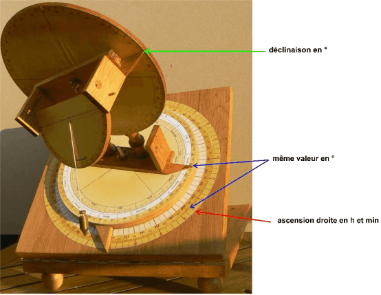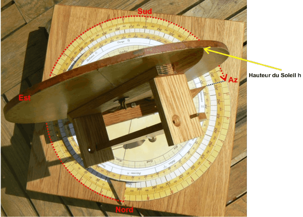 ➩ Les pointes de l’alidade donnent la valeur de la déclinaison du Soleil en degrés.