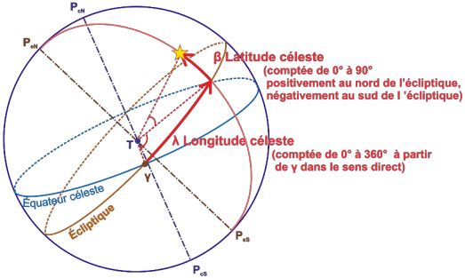 Coordonnées écliptiques : longitude céleste et latitude céleste.