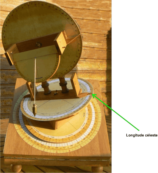 Le plan écliptique et son appareil sont fixés sur le support qui correspond à l’obliquité de l’écliptique.
