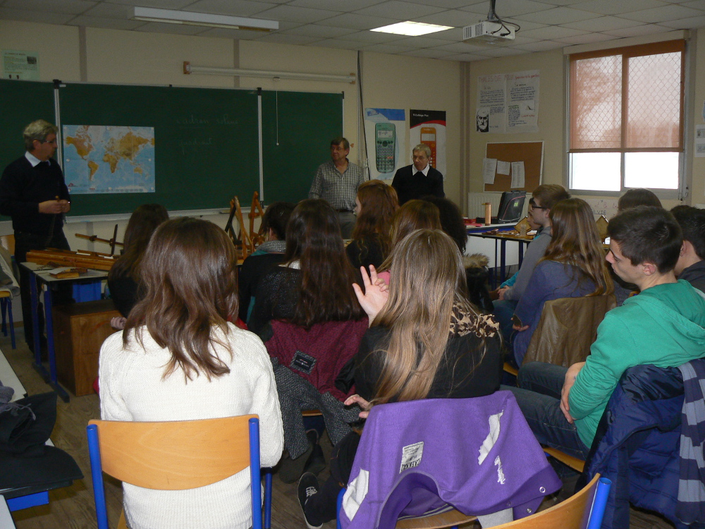 Au collège de l'Hermine, intervention dans trois classes de troisième (projet pédagogique avec le lycée français Sainte Pulchérie à Istanboul, Turquie) : présentation d'instruments de navigation astronomique et d'instruments d'astronomie, manipulation par les élèves au soleil dans la cour.